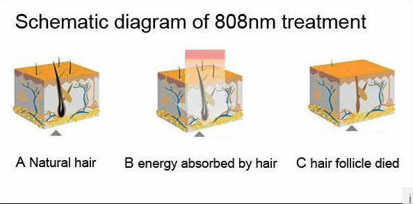808nm diode laser is absorbed by the pigment. It is absorbed by the black pigment of the hair follicle,