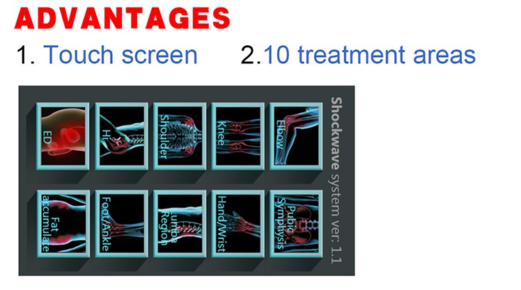The shockwave system uses the ballistic principle of shock wave generation: A pressure wave is formed via a shock wave machine by using accelerated compressed air. The compressed air is generated by an electronically-controlled ballistic-pressure compressor.Using elastic impact, the kinetic energy of the shock wave machine is transferred into the probe of the applicator and then into the client's body.Consequently, during the treatment,the end of the applicator must be in direct-contact with the skin and subcutaneous tissue.